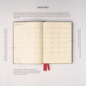 Deine Jahresziele kannst du wunderbar in der Übersicht auflisten, benennen und verfolgen. Die strategsiche Ausarbeitung erfolgt jedoch auf den Folgeseiten der Projektplanung. Für die erfolgreiche Umsetzung überträgst du deine Ziele dann Monat für Monat und Woche für Woche. Jedes Quartal, alle 3 Monate, befindet sich ein Ausschnitt in der Wochenansicht zur Beurteilung deines Projektfortschritts, um sicherzustellen, dass du „On-Track“ bleibst. Alle Seiten bieten dir genügend Struktur und zeitgleich Freiraum, damit der Planer sich genau an deine Bedürfnisse anpasst und deinen Erfolg wahrscheinlicher macht.